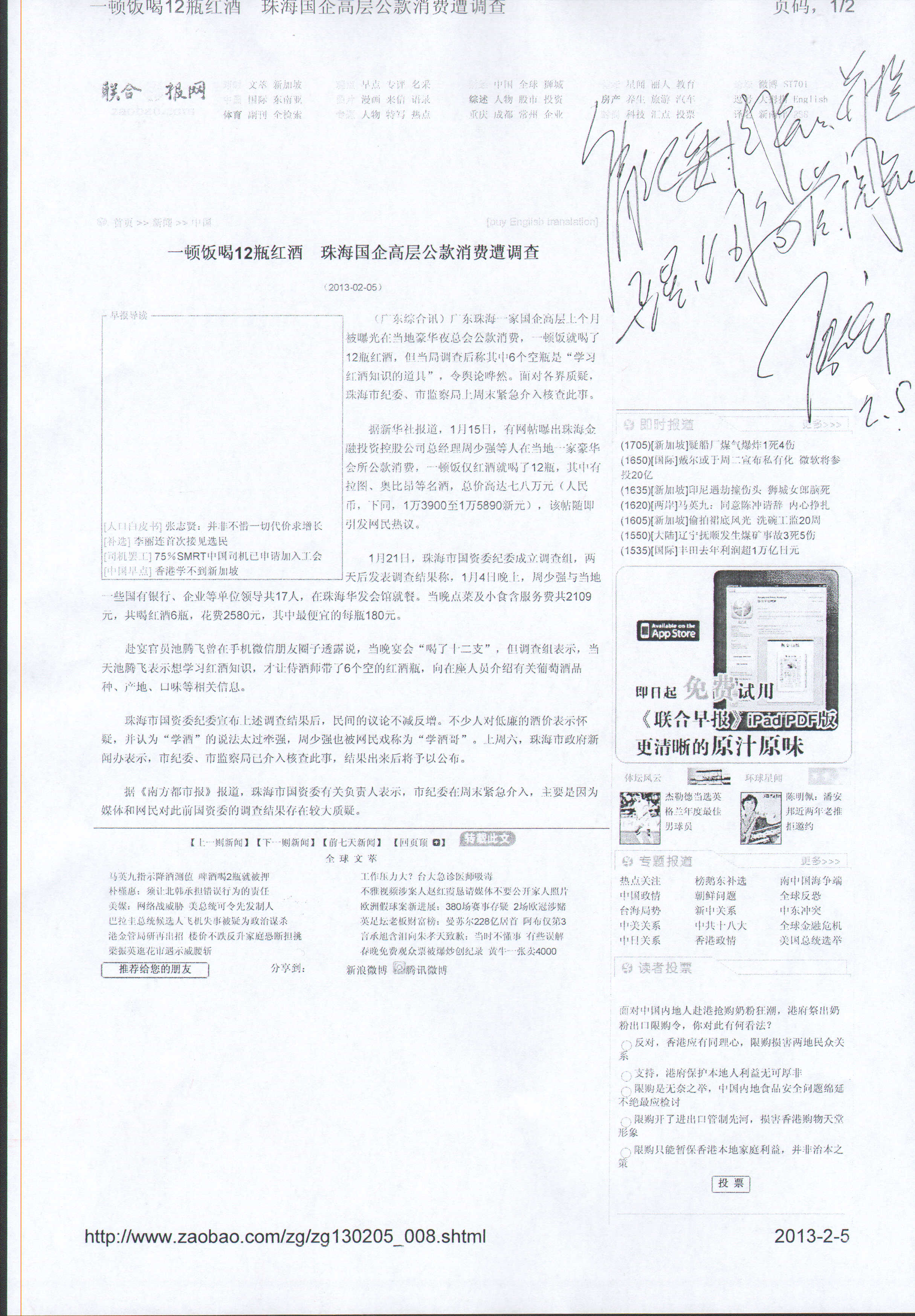 陸金龍董事長對網(wǎng)載“珠海國企高層公款消費(fèi)”作出批示,提醒公司高管引以為戒2月5日聯(lián)合早報網(wǎng)...