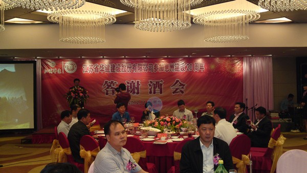 11月4日,公司在惠州凱賓斯基酒店王子飯店隆重召開參加惠州建設(shè)20周年慶典暨答謝酒會,公司副董事長、總經(jīng)理宗有農(nóng)主持酒會并作開場致辭。惠州市有關(guān)政府部門、部分合作方企業(yè)的負(fù)責(zé)人,華建聯(lián)盟成員單位負(fù)責(zé)人,公司董事、監(jiān)事和高管等130余人出席慶典。惠州公司總經(jīng)理華恒榮介紹了公司參加惠州建設(shè)20年的有關(guān)情況。惠州市工商聯(lián)主席、公司戰(zhàn)略合作伙伴恒宇實(shí)業(yè)集團(tuán)公司董事長楊滿芳代表合作方發(fā)言,惠州市住房和城鄉(xiāng)規(guī)劃建設(shè)局副局長陳訓(xùn)政代表政府主管部門致辭,分別對江蘇華建進(jìn)駐惠州施工、參加惠州建設(shè)20周年表示祝賀。公司董事長陸金龍代表公司總部對惠州市有關(guān)政府部門、相關(guān)合作方和社會各界人士給予公司的關(guān)心和支持表示誠摯的感謝,并表達(dá)了進(jìn)一步加大支持力度、加強(qiáng)戰(zhàn)略合作、加快科學(xué)發(fā)展的意愿。