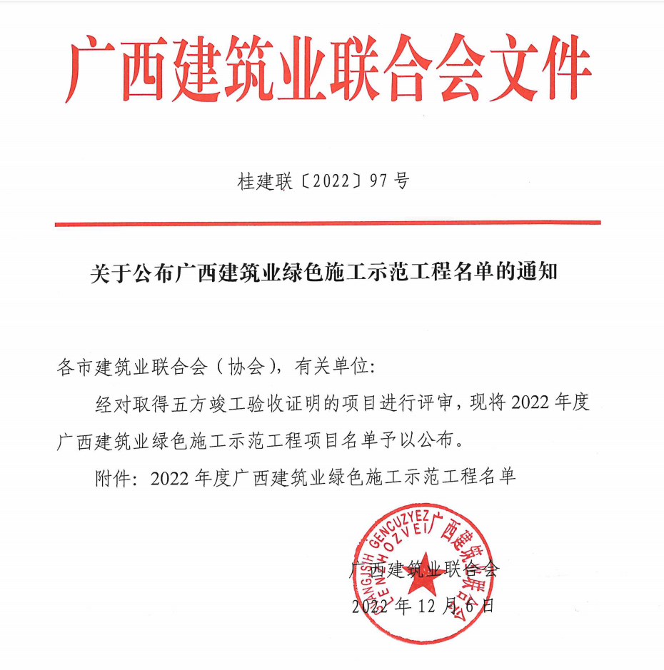 北京分公司兩項工程獲廣西建筑業(yè)綠色施工示范工程安全創(chuàng)優(yōu)獎項 時間:2022-12-30 2011 近日,從廣西建筑業(yè)聯(lián)合會傳來喜訊,由北京公司總包承建的楊柳郡柳園1#、2#、3#、4#樓及地下室項目和楊柳郡柳園5#、6#、7#及地下室項目榮獲“2022年度廣西建筑業(yè)綠色施工示范工程”光榮稱號。
