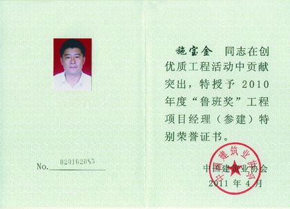 施寶金 時間:2012-04-10 7608 施寶金,高級工程師,現任深圳公司七處二工區常務副主任、項目經理。1996年到深圳參加工作,參與過國際商會中心、榮超經貿中心、江勝大廈、綠景紀元大廈等重點項目施工,獲“深圳市建筑業企業優秀項目經理”稱號,被授予“創魯班獎工程項目經理特別榮譽證書”。