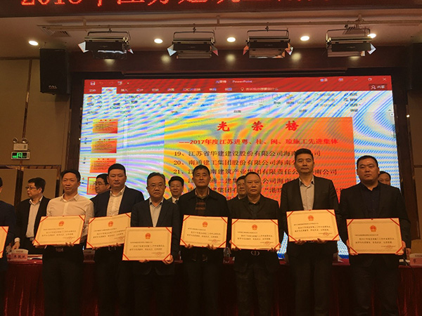 近日,在2018年江蘇建筑業南方片區和中南片區年度工作會議上,江蘇省住建廳發文表彰了一批出省施工先進集體和先進個人,海南公司被表彰為2017年度出省施工先進集體,公司副總、海南公司總經理陸俊以及杜宇、李明被表彰為先進個人。此外,蘆開春、生小荃和湯小慶分別被江蘇省駐深圳(廣州)辦事處表彰為質量安全、經營財務和新聞報道先進個人。