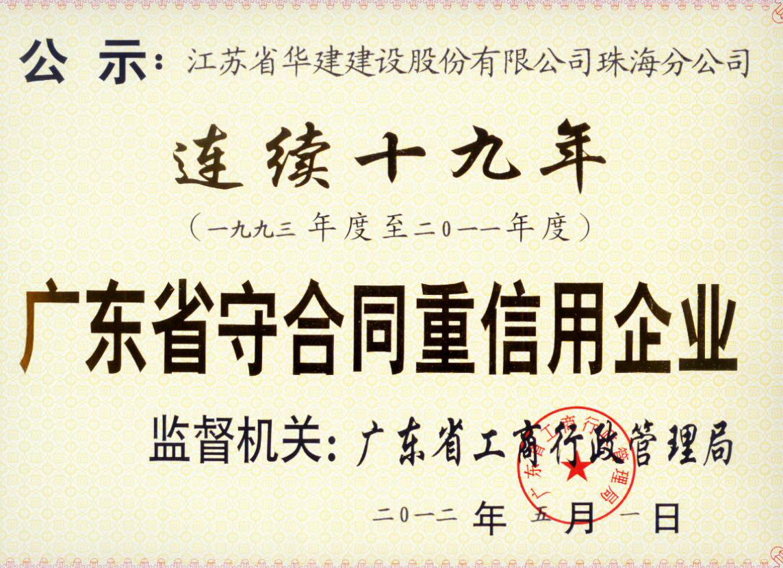 珠海公司連續19年榮獲“廣東省守合同重信用企業”榮譽稱號 時間:2012-06-28 5791 珠海公司連續19年榮獲“廣東省 守合同重信用企業”榮譽稱號 五月份珠海分公司被廣東省工商行政管理局授予“連續十九年廣東省守合同重信用企業”榮譽稱號。
