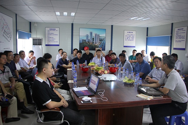 9月8日,在珠海公司總工程師周學軍陪同下,由深圳公司常務副總經理、總工程師吳碧橋帶隊,深圳公司各工程處生產主任、技術主任、項目經理等一行33人到珠海公司承建的帝景灣山莊和晉和天慶花園項目觀摩交流鋁合金模板施工技術。周總通過圖文并茂的PPT講解和現場實地觀摩詳細介紹了鋁合金模板施工技術特點以及與傳統木模板施工的差別,對施工過程關鍵節點做法、成本控制做了講解。雙方人員針對細節和質量控制問題進行了深度交流。