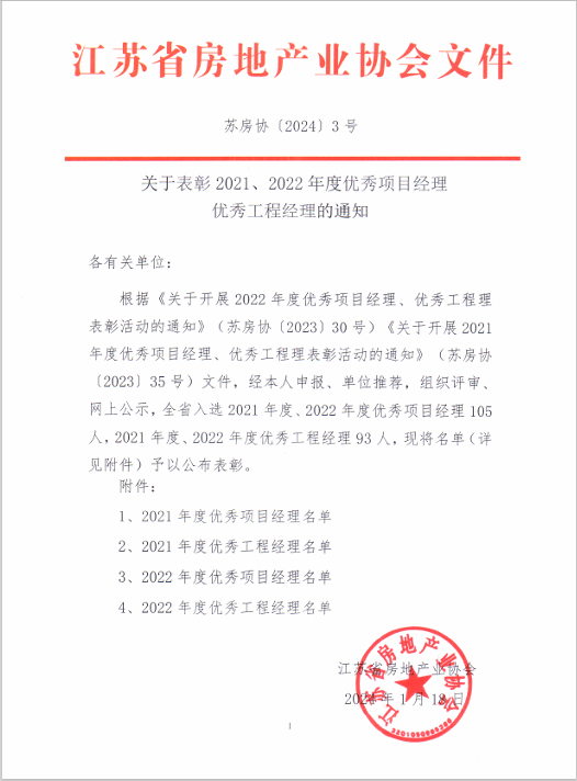 近日,江蘇省房地產(chǎn)協(xié)會(huì)公布了《關(guān)于表彰2021、2022年度優(yōu)秀項(xiàng)目經(jīng)理、優(yōu)秀工程經(jīng)理的通...
