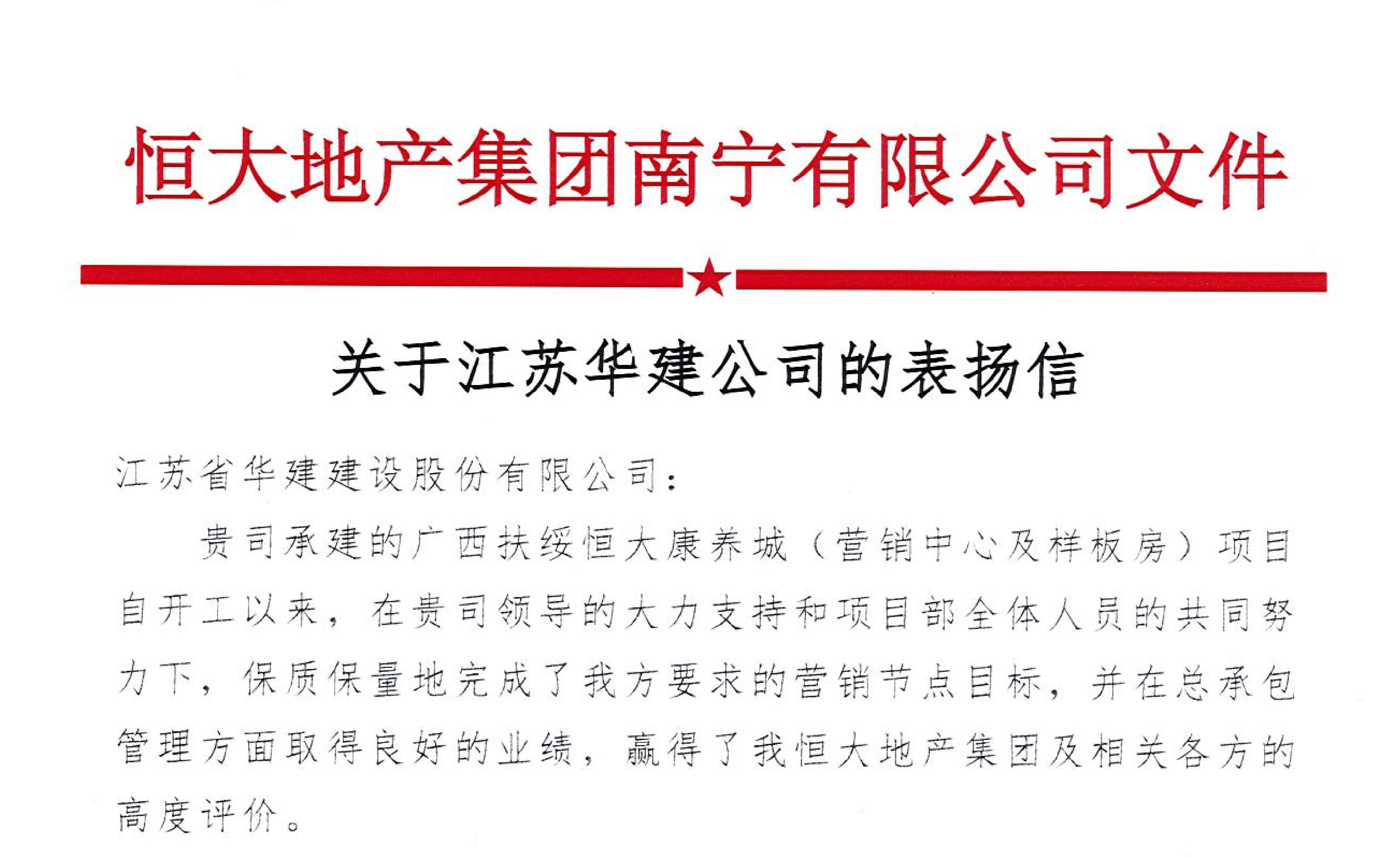 近日,公司收到恒大地產(chǎn)集團(tuán)南寧公司發(fā)來的表?yè)P(yáng)信,信中對(duì)我公司出色完成廣西扶綏恒大康養(yǎng)城營(yíng)銷...