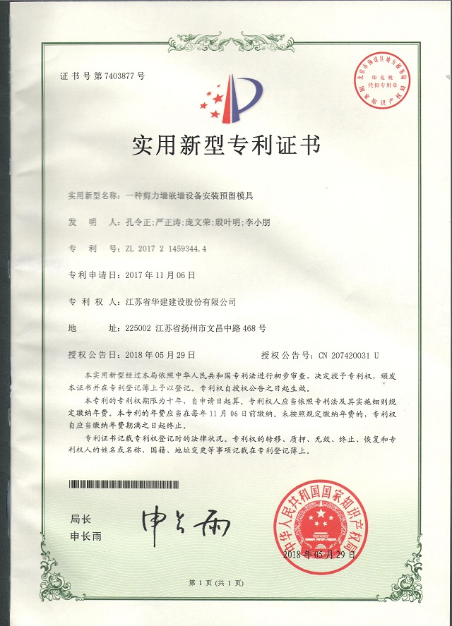近日,從國(guó)家知識(shí)產(chǎn)權(quán)局傳來(lái)喜訊,公司申請(qǐng)的《一種剪力墻嵌墻設(shè)備安裝預(yù)留模具》獲得實(shí)用新型專...