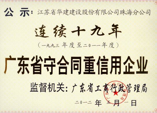 公司連續19年榮獲“廣東省守合同重信用企業”榮譽稱號