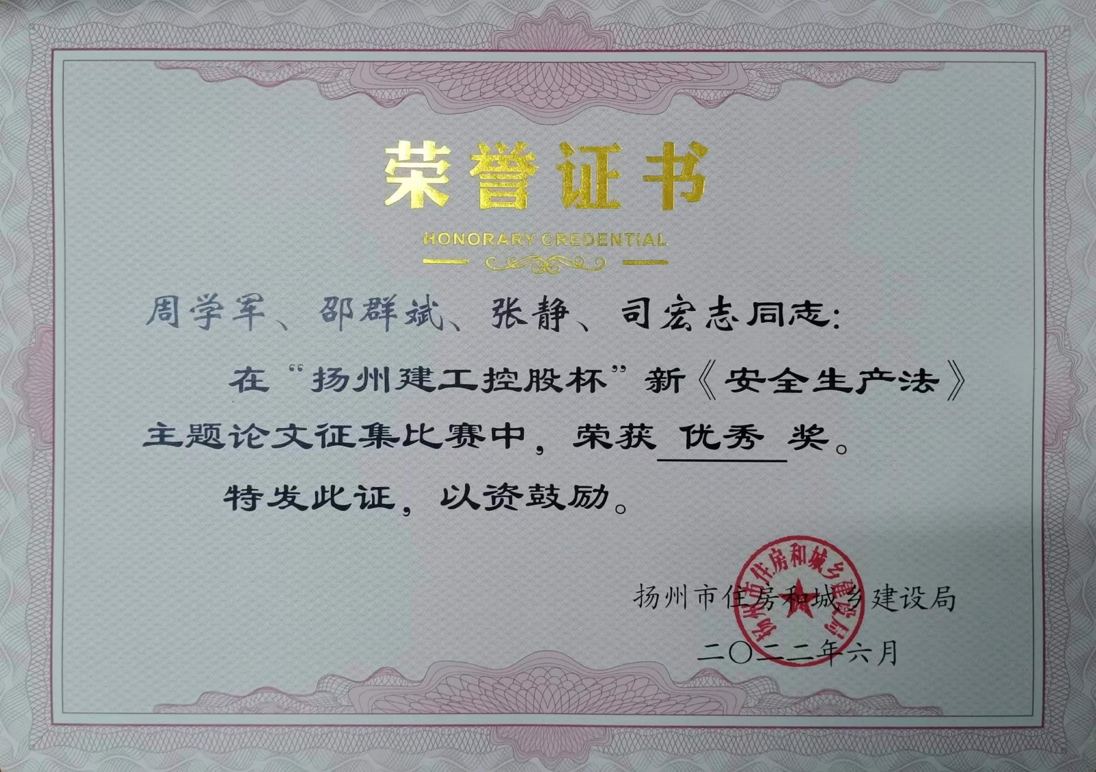 北京分公司4篇論文獲揚州市新《安全生產法》主題論文征文比賽獎項 時間:2022-07-16 3810 近日,從揚州市住房和城鄉建設局傳來喜訊,由北京公司投稿的4篇論文榮獲“揚州建工控股杯”新《安全生產法》主題論文征文比賽獎項,并獲頒證書,其中一等獎一項,三等獎一項,優秀論文獎兩項。