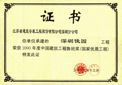 深圳俊園獲98年深圳市文明工地,99年獲江蘇省優(yōu)質工程金獎,同年被授江蘇省建筑業(yè)新技術應用示范工程,2000年獲江蘇省“揚子杯”獎,深圳市優(yōu)質樣板工程第一名和金牛獎及全國建筑業(yè)最高獎“魯班獎”。