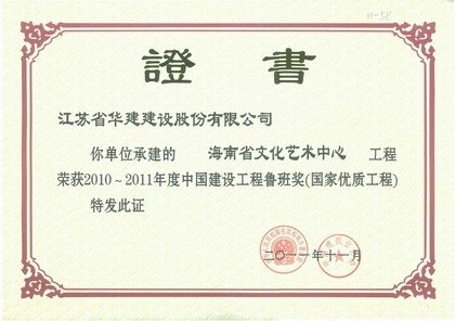 海南省文化藝術中心(海南省歌舞劇院)是海南省委、省政府在“十一五規劃” 期間實施的重點惠民公共文化設施,是海南文藝繁榮發展的新座標。坐落于海南文化公園中軸線上,工程建筑面積23500平方米,東西長128米,南北寬113米,高33米,包括可同時容納1300人的劇場、演出輔助用房、排練房等建筑,建筑造型酷似一只展翅飛翔的大鳥。工程總造價1.94億元。先后獲得2009年度國家AAA級安全文明標準化誠信工地、全國優秀質量管理小組稱號及全國質量信得過班組稱號等多項榮譽。通過技術創新,獲得省級工法兩項、省級QC成果兩項、省級優秀技術論文三篇,被評為海南省新技術應用示范工程。2011年11月,榮獲2010-2011年度中國建設工程魯班獎(國家優質工程),是公司獲得的第16個“魯班獎”項目。