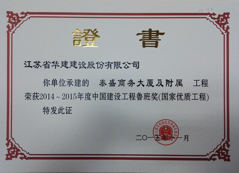 秦皇島泰盛商務大廈 時間:2015-11-23 17307 泰盛商務大廈及附屬工程地處秦皇島市經濟開發區核心位置,集商務辦公、會議中心、一站式服務大廳及報告演藝廳等功能為一體的綜合類商務辦公樓,地下1層,地上23層,裙樓兩層,建筑面積90148㎡,建筑高度97.75米。工程先后榮獲全國建筑業綠色施工示范工程、江蘇省新技術應用示范工程、江蘇省省級工法、河北省結構優質工程獎、河北省建設工程安濟杯獎(省優)、全國優秀項目管理成果獎、全國優秀QC小組成果一等獎。2015年,被中建協評為2014-2015年度中國建設工程魯班獎(國家優質工程)。