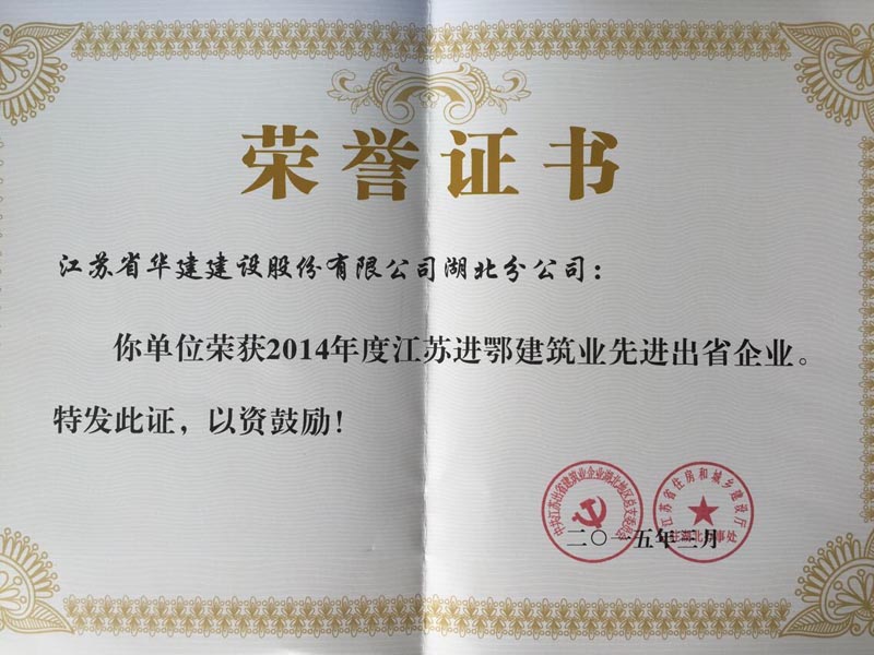 湖北分公司首獲2014年度江蘇省進鄂建筑業先進企業