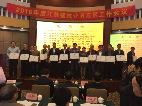 3月24日上午,江蘇省人民政府駐深圳(廣州)辦事處和江蘇省住房和城鄉建設廳在廣西南寧召開2015年度江蘇進粵、桂、閩、瓊施工工作會議,公司副總、海南公司總經理王宏出席會議。會上,海南分公司被表彰為“2015年度江蘇進粵、桂、閩、瓊施工先進企業”,海南分公司副總、總工程師高家馴被表彰為優秀企業經理。