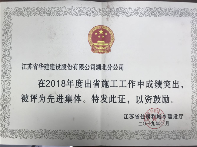 湖北分公司獲評2018年度江蘇出省施工先進集體