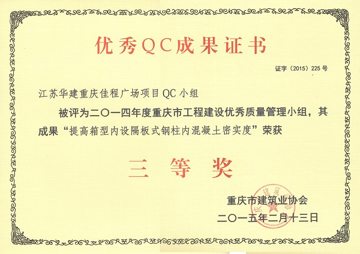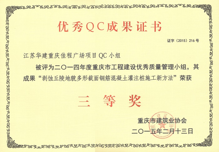 公司3項QC成果榮獲重慶市三等獎 時間:2015-04-02 4668 近日,重慶市建筑業協會發文表彰了一批優秀QC成果,公司重慶佳程廣場項目QC小組被評為2014年度重慶市工程建設優秀質量管理小組,其成果“提高箱型內設隔板式鋼柱內混凝土密實度”、“剝蝕丘陵地貌多形截面鋼筋混凝土灌注樁施工新方法”、“重慶佳程廣場基礎工程大體積混凝土裂縫成因分析和預控”等均榮獲三等獎。
