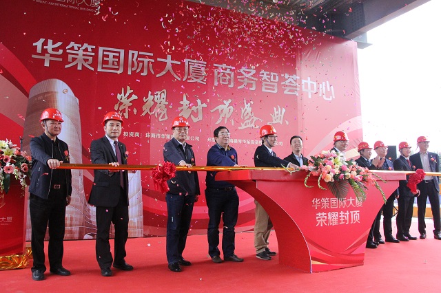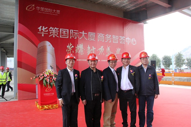 2017年1月9日,第八項目部承擔(dān)施工任務(wù)的華策國際大廈項目舉行主體結(jié)構(gòu)封頂儀式。橫琴新區(qū)黨委副書記葉真、橫琴新區(qū)建設(shè)環(huán)保局局長劉晨光,華策集團董事局主席楊峰、副主席楊智雄、總裁余道群,江蘇華建副董事長、總經(jīng)理宗有農(nóng)、珠海公司總經(jīng)理繆國樞、深圳公司常務(wù)副總吳碧橋、深圳公司副總經(jīng)理蔣超,以及來自華策集團、設(shè)計單位、參建單位、監(jiān)理單位和珠海區(qū)域公司相關(guān)人員共200余人出席儀式。華策國際大廈整體分為東塔和西塔兩部分,西塔已于2016年11月8日封頂,隨著東塔的順利封頂,華策國際大廈全面封頂,并將于2017年部分投入使用,2018年底全部投入使用。