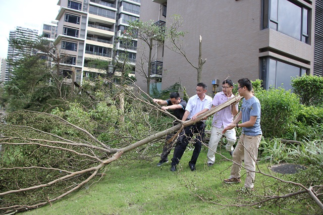 中午11時開始,臺風(fēng)臨近,狂風(fēng)暴雨橫掃珠海,中午13時許,臺風(fēng)中心正面登陸珠海,出現(xiàn)了短暫的平靜。公司隨即指示各項目部不得松懈,所有人員不得離開安全區(qū)域。緊接著,臺風(fēng)再次肆掠。14時許,金灣區(qū)停水、停電、通訊中斷。23日下午,在經(jīng)歷過臺風(fēng)的侵襲后,珠海道路樹木大片倒伏,交通基本癱瘓。公司利用偶有通訊信號的機(jī)會聯(lián)系各項目部確認(rèn)受災(zāi)情況。因部署及時,本次臺風(fēng)并未造成人員傷亡。