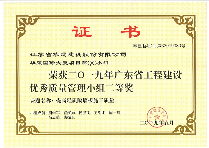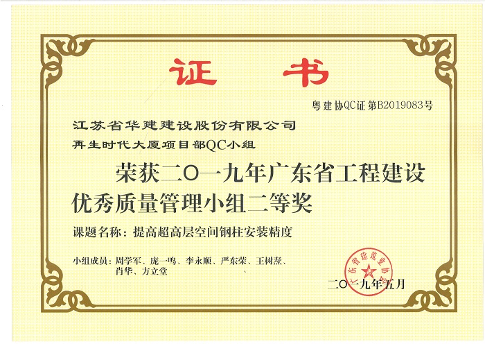 公司新添4項省級工程建設優秀QC成果 時間:2019-07-11 3726 近期,廣東省建筑業協會發文公布了2019年度廣東省工程建設優秀質量管理小組名單,公司華策國際大廈項目部QC小組“提高輕質隔墻板施工質量”、再生時代項目部QC小組“提高超高層空間鋼柱安裝精度”兩項成果喜獲二等獎,華策國際大廈項目部QC小組“提高鋼結構工程高強螺栓安裝合格率”榮獲三等獎。 華策國際大廈項目部QC小組“設備機房減振降噪的創新方法”成果在江蘇省建筑業協會組織的2019年度江蘇省工程建設質量管理小組活動中榮獲二等獎。